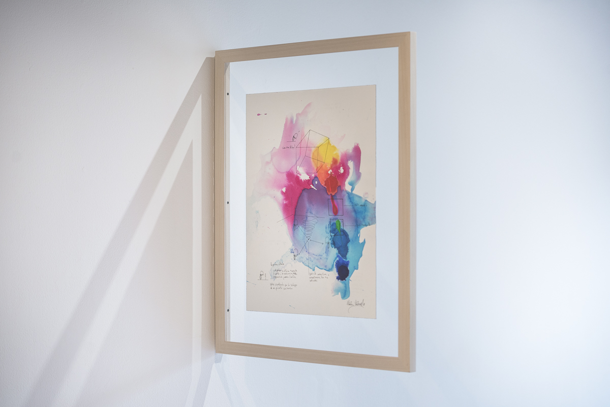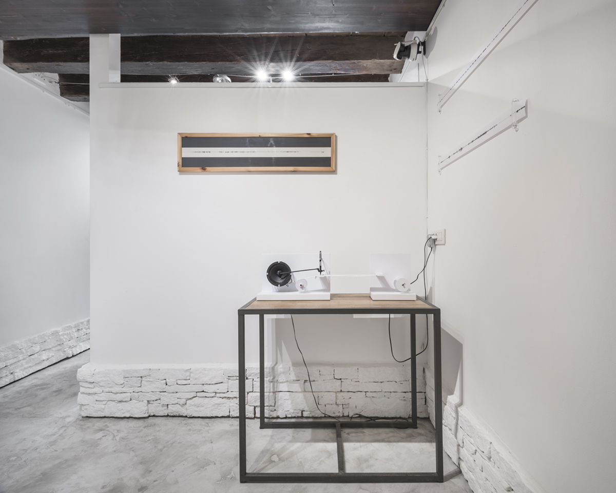 The site-specific installation created by Zorio, entitled “Moti Umani”, immediately impresses with its aesthetic refinement and ability to intervene in space, enveloping it and becoming an integral part of the environment itself. What appears to us is a speaker that through the production of vibrations triggers a real process of writing on reels of paper of several meters. The sound tracks that are reproduced by it are the result of recordings made during moments of great human aggregation. Circumstances of union of people selected by the artist with the aim of making us reflect on how much consciously or unconsciously man leaves a trace in his environment and more generally in the earth system. This work, which finds an easy analogy in its functioning with the seismograph, stands as a meeting point of the three temporal dimensions, i.e. past, present and future. We can identify as past the reproduced recording, present the act of transcription and future the result of the same hypothetically. In fact, it is plausible to imagine an archives made up of the results of transmissions of recordings on paper, since they represent a form of writing of the spoken language in which the intonation is not lost.