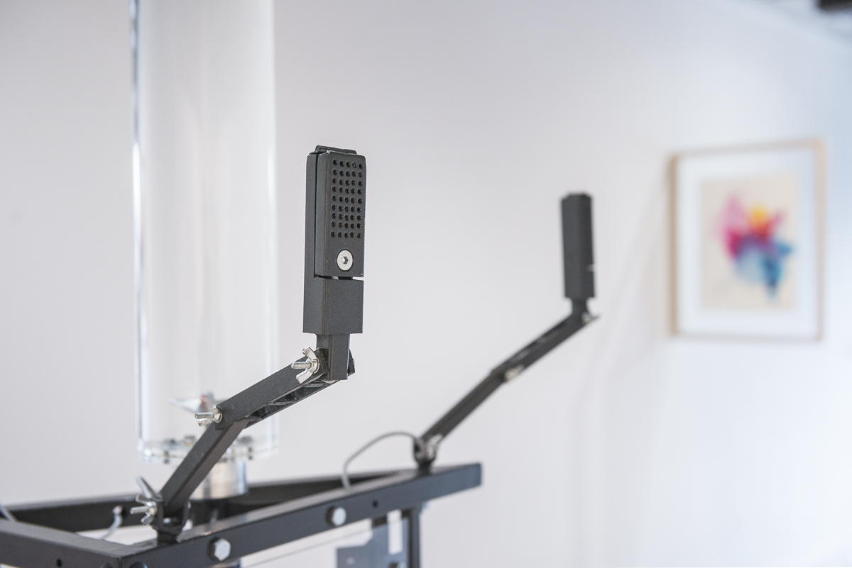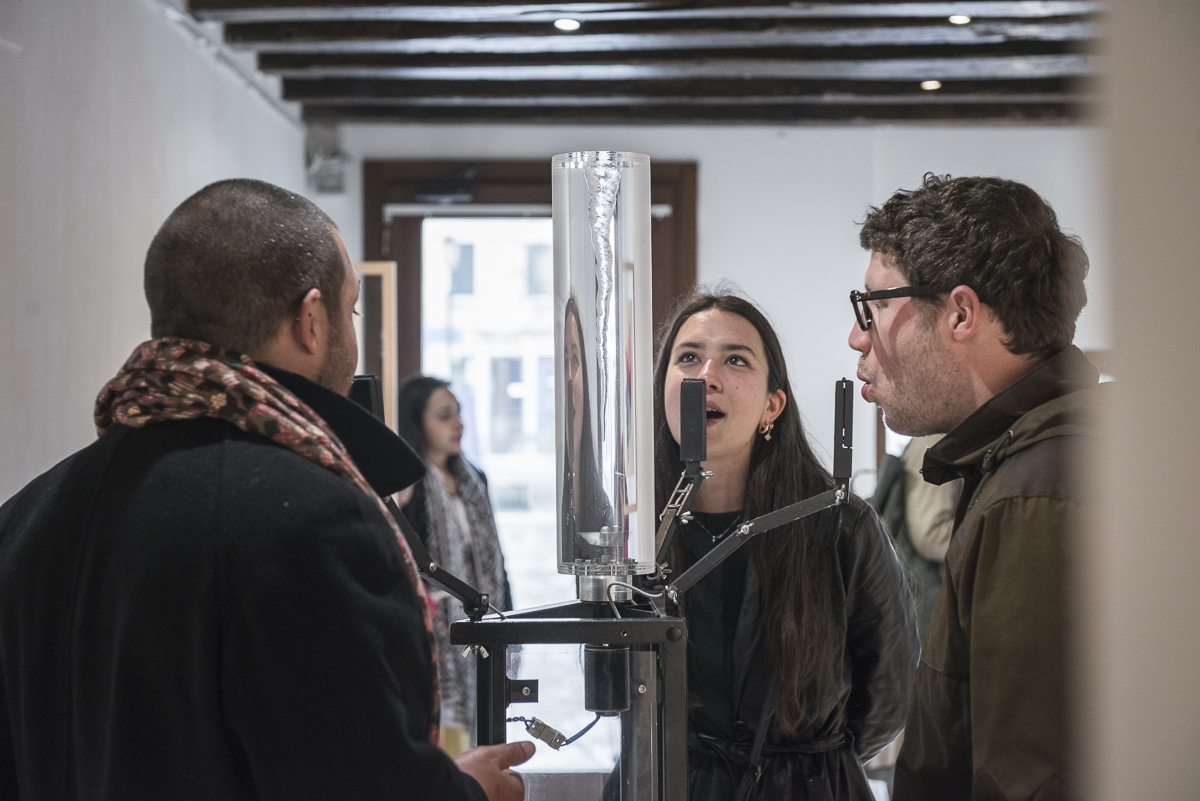 Entering more in the detail, we find in the R.B.V.O.T.L. (01) – Rilevatore di benessere del vicinato per ottimizzare la tranquillità di un luogo – the intention of Vettorello to create an interactive biometric sculpture that invites a group of three people to relate to each other. The machine in question, of a strong sculptural nature, is put into operation through a synchronous breathing exercise, through which a controlled natural event unfolds in the form of a vortex enclosed in a Plexiglas cylinder filled with water. Its importance lies in the elegance of this element that is not randomly selected and indeed conveys a powerful message. As can be seen from the very title of the work, the ritual that is enacted leads to the realization of an activity that puts the users in communion with their own bodies as well as with each other, with positive results for the entire surrounding environment. “The goal is the absolute perception of the present so that a common cognitive feeling of the whole is created,” which leads to living with real awareness the concepts of union and community and the strength that the individual can draw from them.