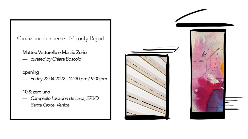 10 & zero uno is pleased to open the doors of its space in Venice to the public for the first time during the opening week of the Biennale on Friday, April 22 from 12:30 to 9 p.m., presenting “Condizione di Insieme – Majority Report”, a bipersonal exhibition by Matteo Vettorello and Marzio Zorio, curated by Chiara Boscolo.
