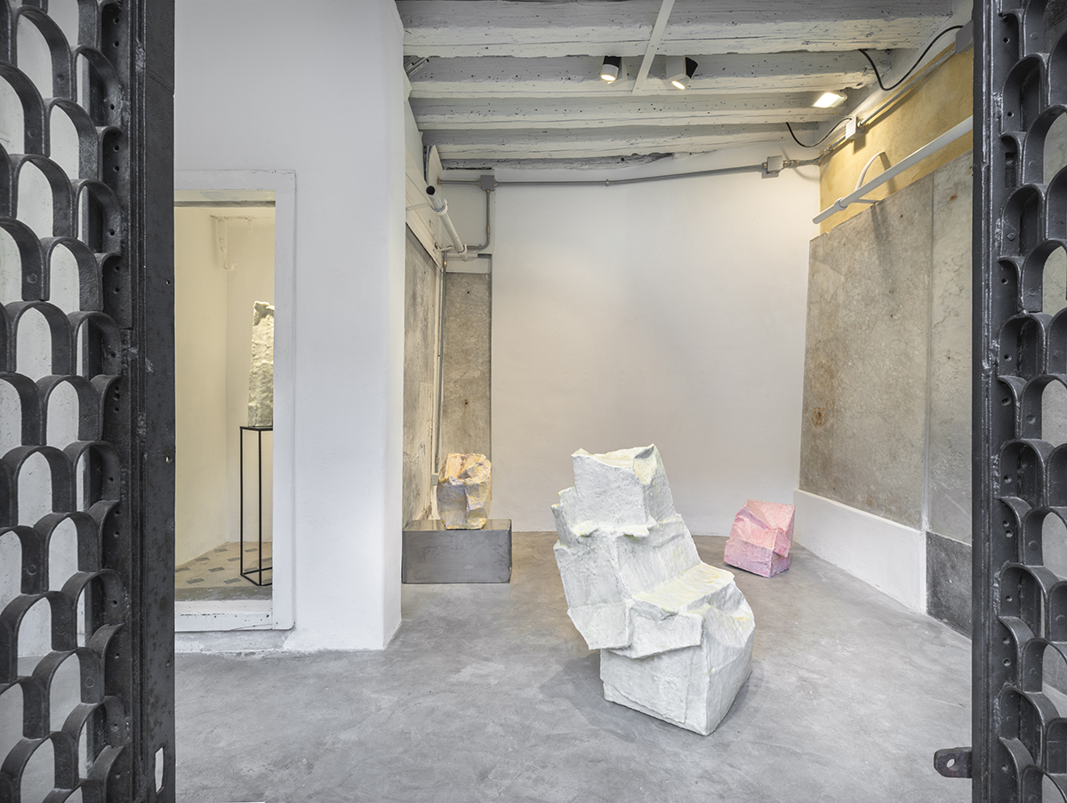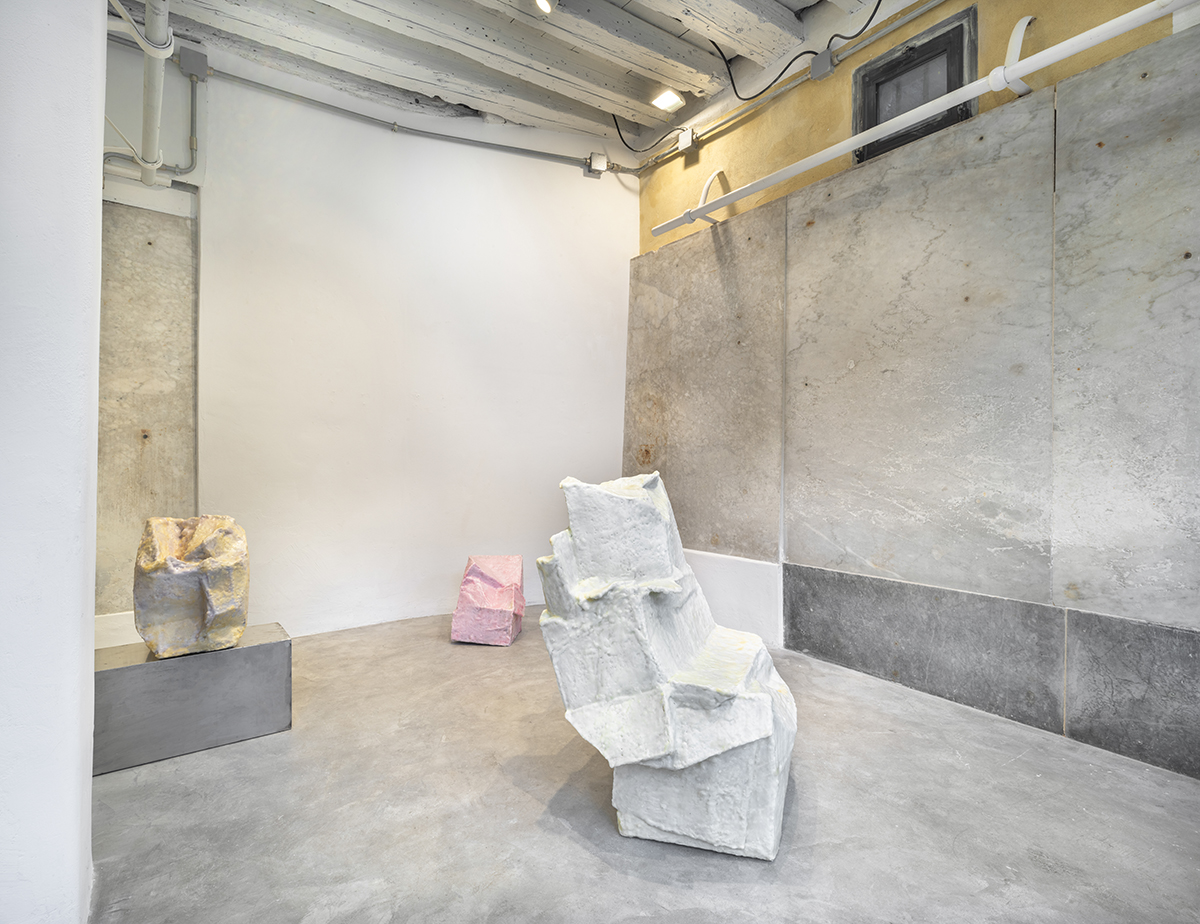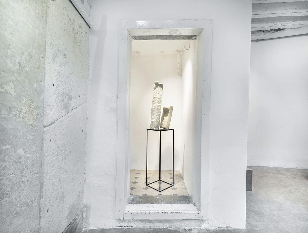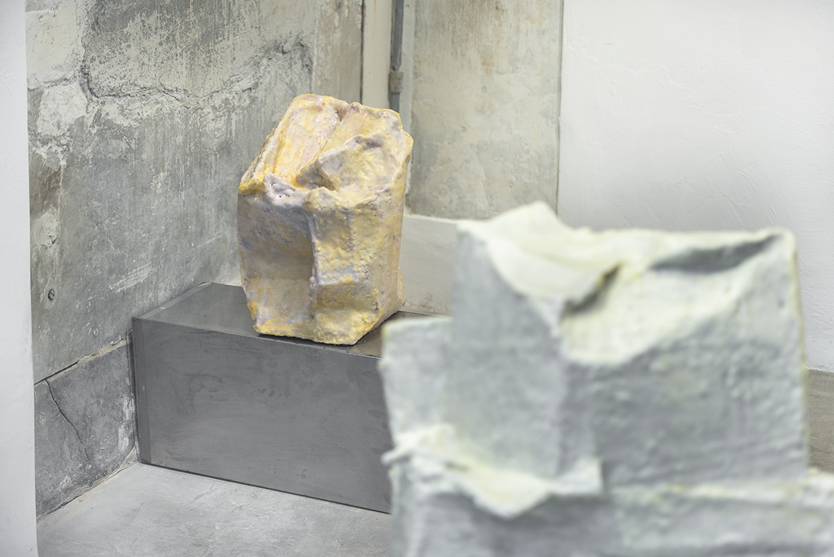 Presented in the exhibition is a body of six new works specially conceived and created for the characteristic spaces of the former butcher shop on Garibaldi Street. Four of them invade the largest room of the gallery developing mainly on the floor while the remaining two are placed on pedestal in the small room on the left where they are enveloped by an aura that seems to elevate them to a sacred object.