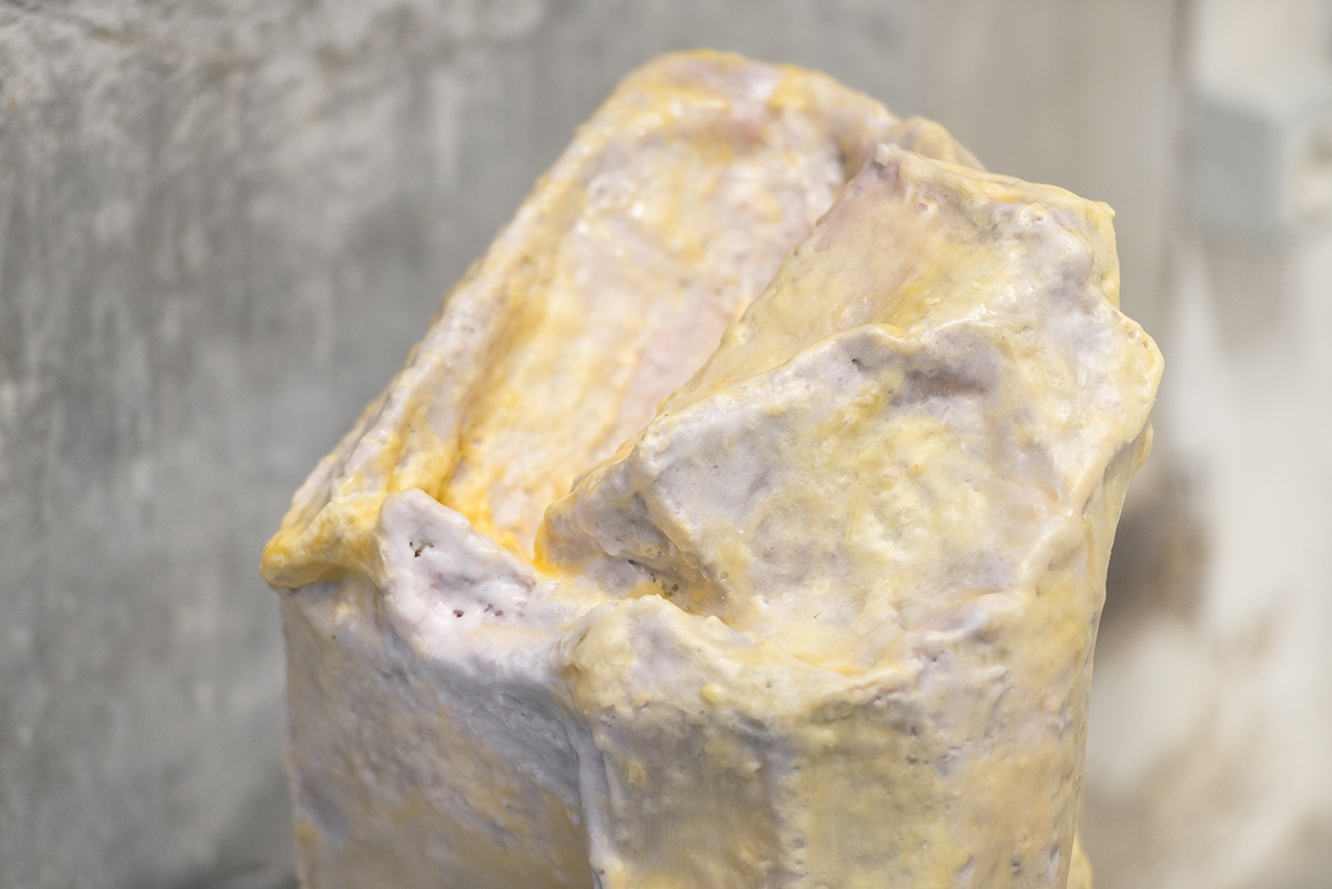 Further reason for analysis is the transformation of what we can identify as structural cardboard skeletons into real works of art given by repeated gestures. A movement that has something of the hypnotic. A continuous dipping of the brush in wax, liquefied and gently applied to the structure. Layer after layer compares organic and inorganic through content analogies between the elements, questioning the relationship between meaning and signifier.
