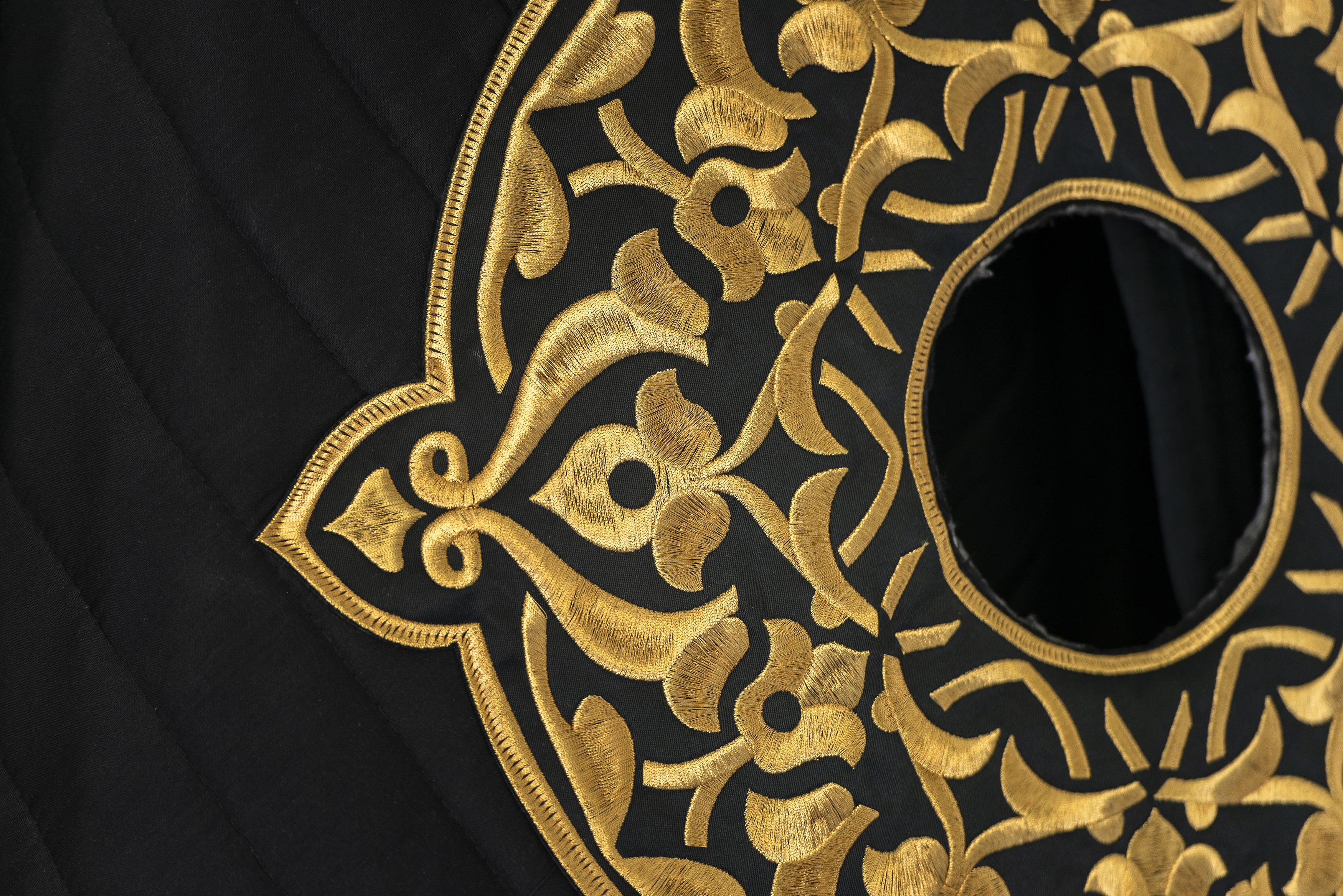 Baseera’s art is bodily, objectifying, tangible, a direct grasp of the courage to unhinge all doubts about clichés, shattering all forms of taboo and prejudice. It achieves this by challenging the notion of iconoclasm, inserting iconic elements and pictograms that become figurative views of the self-determining word. The same is true of their gold embroidery on black robes, which in my opinion looks like a cross between the Islamic technique of Suzani and the Indian technique of Chikankari. One of their psychedelic prayer rugs reads “I am a body,” an idea that reinforces Khan’s identity by liberating their gender dignity. Baseera thinks of a direct consciousness between the human and the other human, a self-determining phenomenological inquiry within society. This is the exact opposite of what Barbara Kruger had to propose in 1989 in the work entitled Your Body is a Battleground.