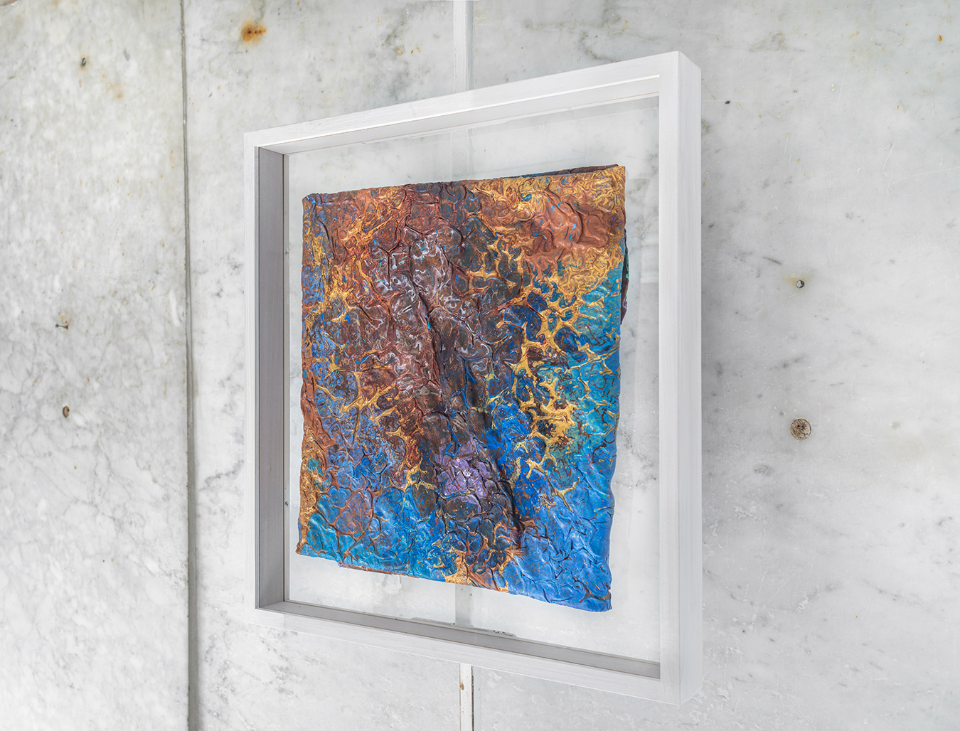 The works Orogenesi and Strato D (from the series Tessuto temporale, 2025-ongoing) appear to be aerial shots of the globe or cutouts of the earth’s surface that refer to the formation of reliefs and a region of the earth’s mantle, respectively. The term surface (from the Latin super-facies, upper face) designates a thickness that delimits a body affected by both inner and outer motions; this element is isolated by the artist by showing how it is composed of various layers that, as in the case of the ground, also fix a precise temporality and can resurface during landslides. Similarly, the irregularities on the skin of the works, the result of the artist’s gesture and the action of the environment, refer to those of the earth. This painting, which begins as a uniform field, ends up behaving like a baroque form, and thanks to its layering allows the creation of undulating movements with effects of dynamic tension. Deleuze in The Fold argued that ‘the informal does not constitute a simple negation of form: it testifies to form as a folded form that exists only as a “landscape of the mental”’: the fold for the author thus becomes the distinctive feature of the Baroque, in a continuous variation that relates matter and soul. Trevisan uses this principle to create the idea of movement that permeates his works; it is a metamorphosis that, as Georges Didi-Huberman states in Ninfa Moderna, has to do with drapery. The latter, elected by Aby Warburg as a ‘pathetic utensil’, has the power to animate the inanimate, and is ultimately an interface of the body – from the bandages to the shroud – that accompanies the passage between the existing and the non-existent, between form and formlessness. The title of the work Lo que toco – Naiadi (2024) refers to the figure of the nymph, a divinity of which Didi-Huberman illustrates the process of separation between body and garment, and consequently the emotions reverberate on the cloth whose fate is formlessness. The artist seems to want to reflect precisely on the fate of the fallen drapery, which obtains a visual autonomy, so her painting acquires a weight and tends to sink downwards. The works in the series Di-spiegare la materia (2024-ongoing), while retaining their object nature, are again placed on the wall and appear as earthy views that take on the appearance of a relic, of a fold locked in its development that conceals a large part of the work while maintaining its tension. The space included in the fold is part of the creation despite its existence being virtual, as is the void embedded in the painting.