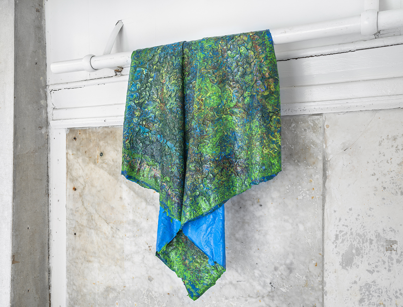 Trevisan’s approach to the chromatic datum is instinctive, he maintains a dialogue with it until he reaches a moment of suspension, and he does this by working on the ground, through a physical relationship with the acrylic substance; in the series Lo que toco (2024) he simulates drapery, an element that dresses the body but is affected by the atmosphere, whose curves generate light and shadow, exhibiting its depth. Colour manifests itself here in its corporeal dimension, the painting emancipates itself from the support and acquires the three-dimensionality, weight and idea of movement typical of reality, giving rise to embodied images where even the reverse can manifest itself. The philosopher Gilles Deleuze, recognising in the Baroque style a textile form that tends to free itself from subordination to a finite body, asserted that ‘perhaps painting needs to break out of the picture and become a sculpture’. In this sense, the artist intends to probe the plastic properties of pictorial matter by creating a hybrid form that mocks the canvas and not only can do without this support but also manages to imitate its textile qualities.