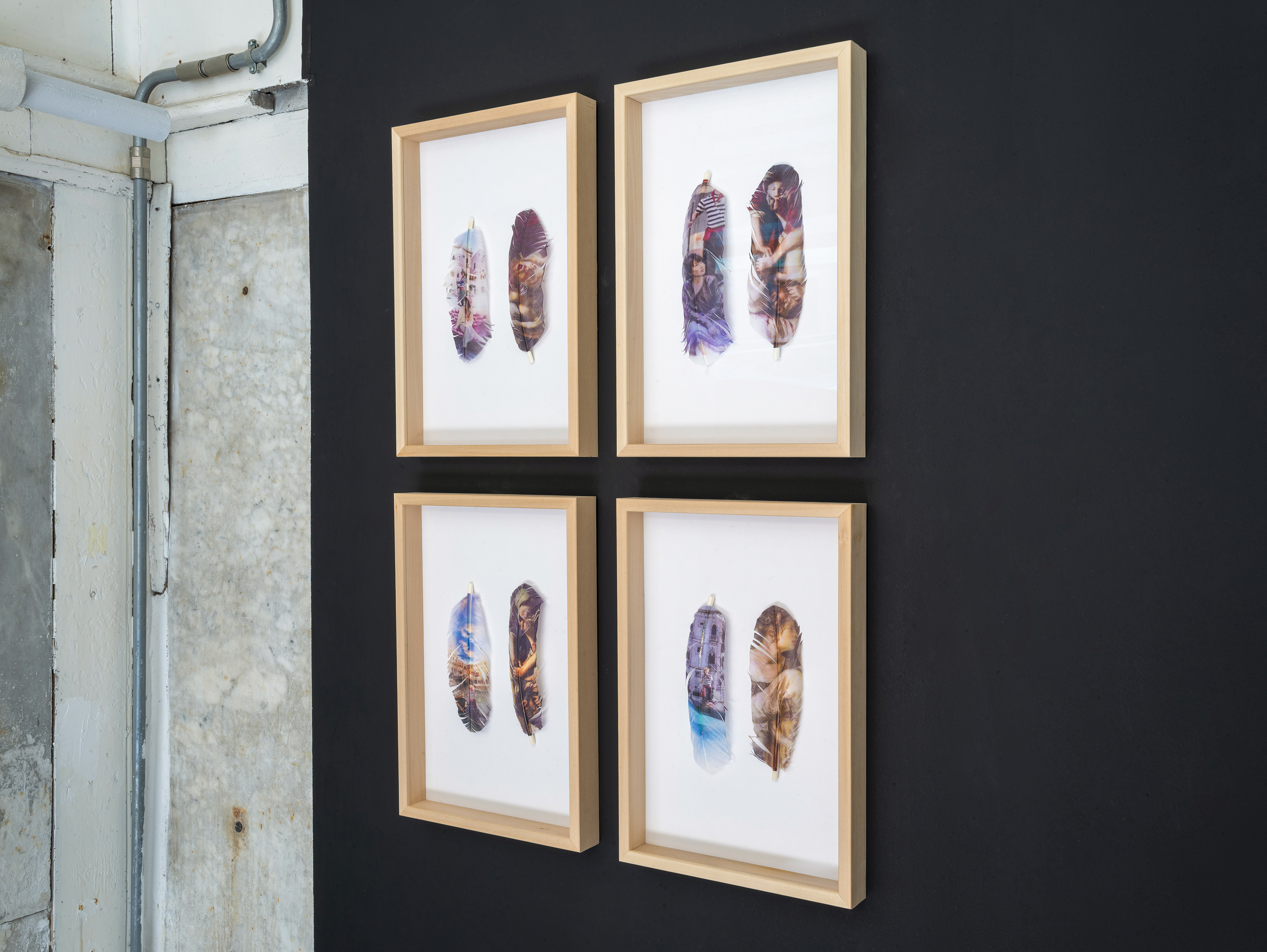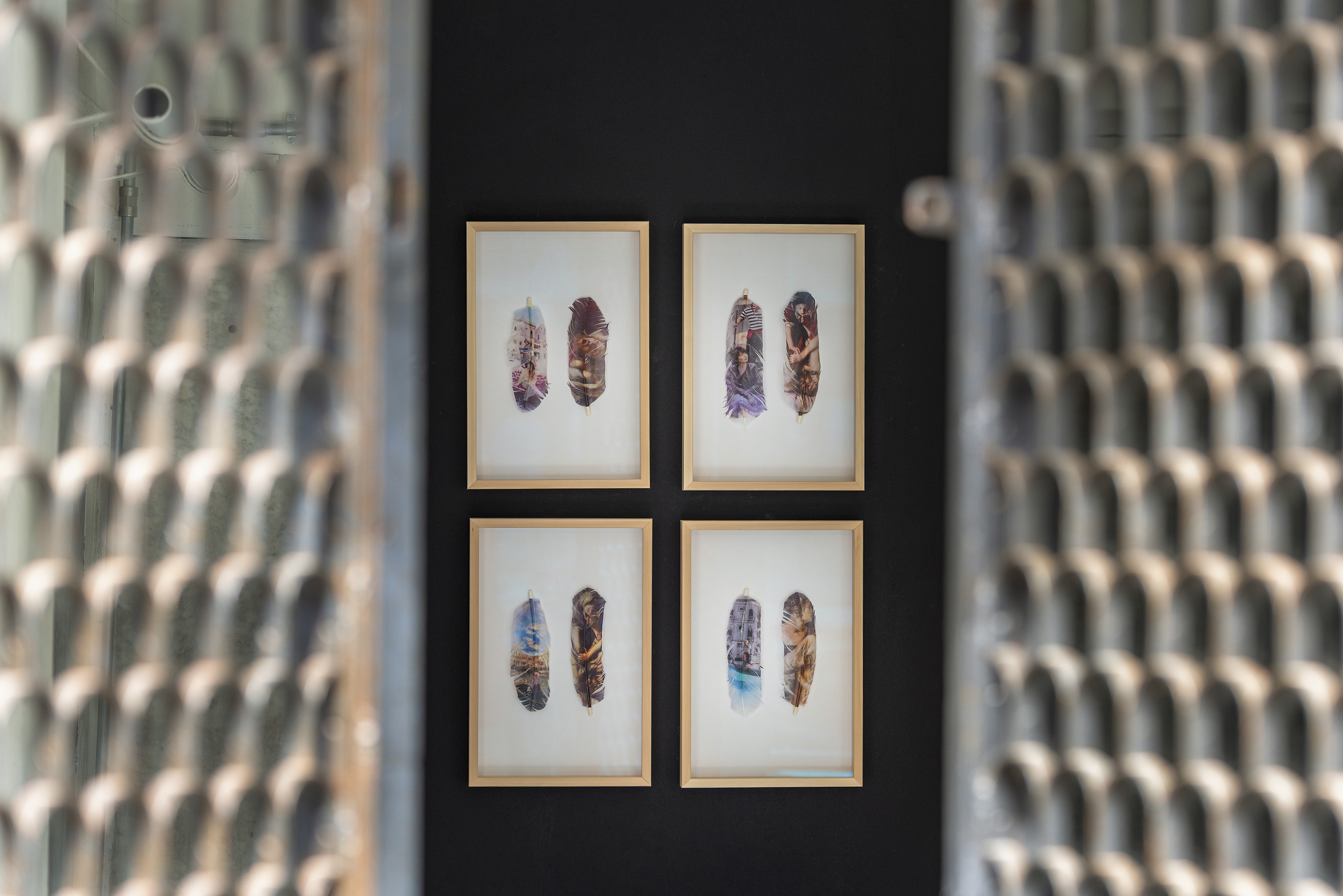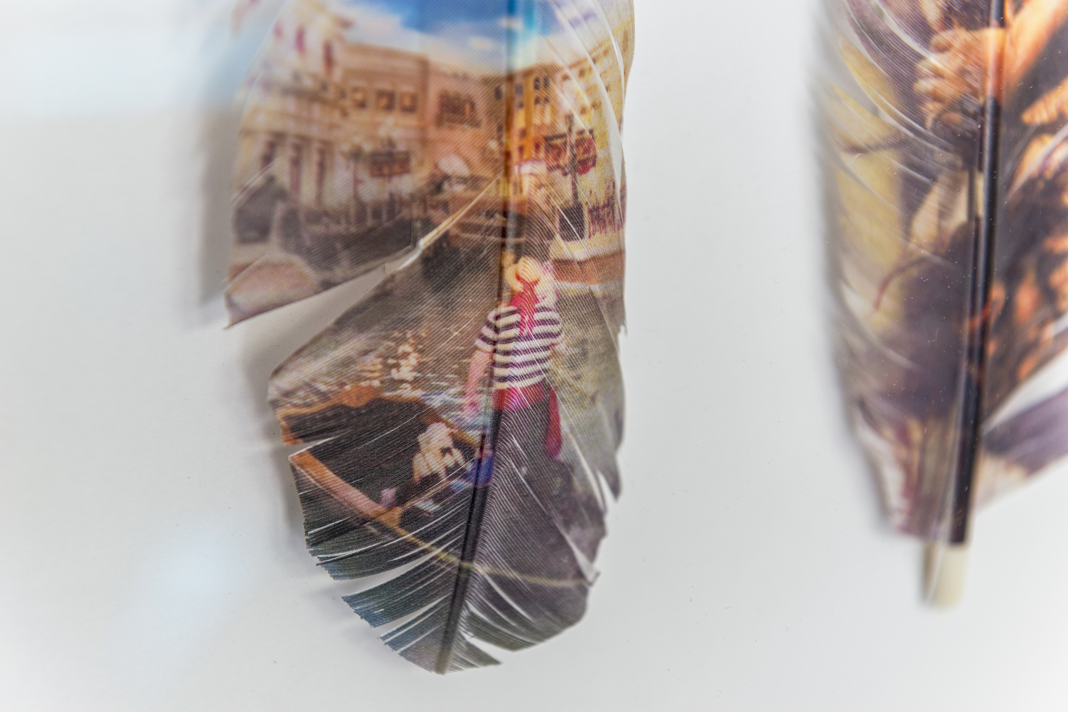 “Naturaleza muerta con plumas: cabezas y góndolas”. Feathers have been a recurring material resource in Sala’s work, used to represent, through an ethereal element—subtle and light—specific cues for much broader reflections. Delving deeper into this initial material reading, one reaches the contrast between the images presented: a symbiosis of past and present, linked by the idea of everyday life, present in both, albeit within different realities.
