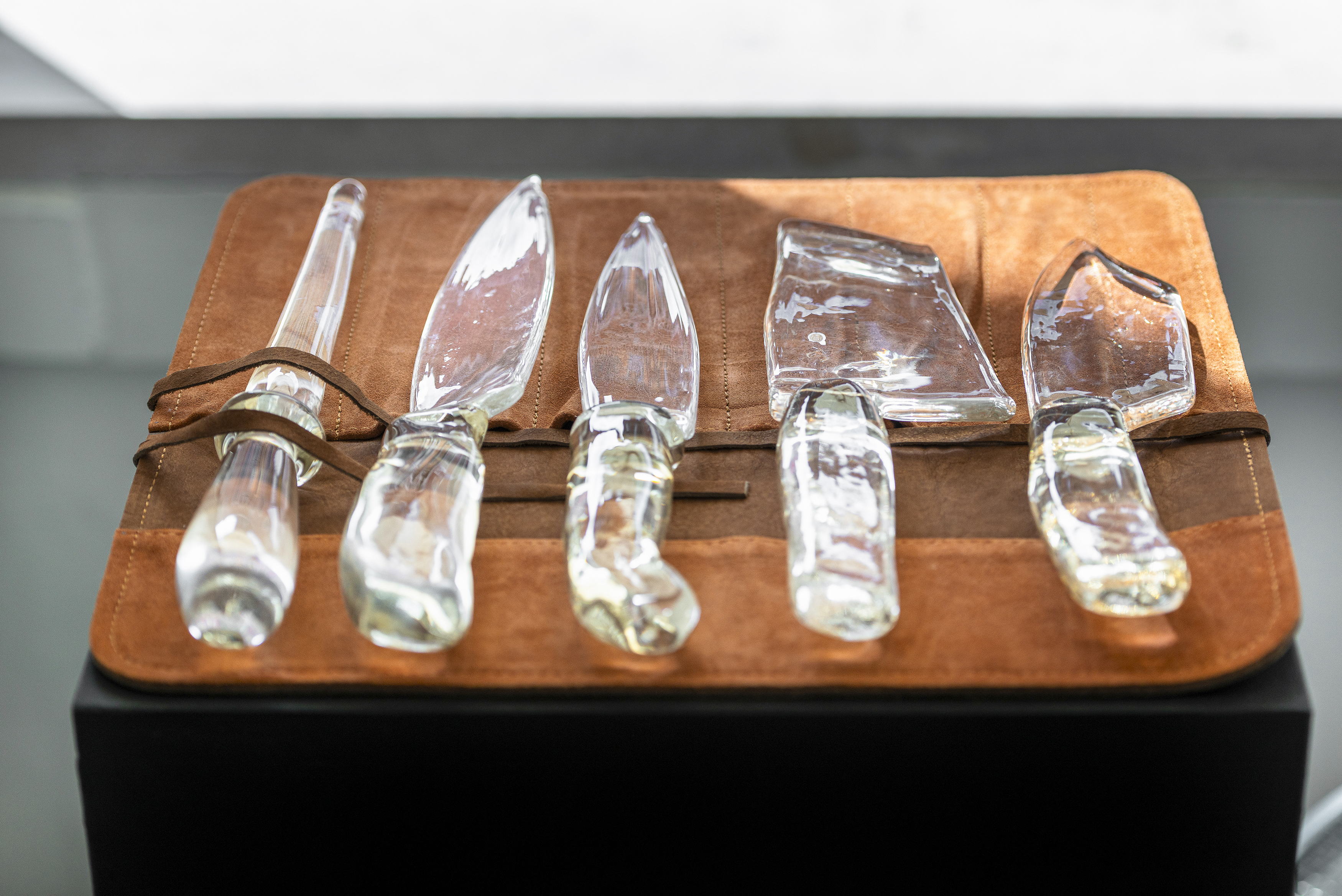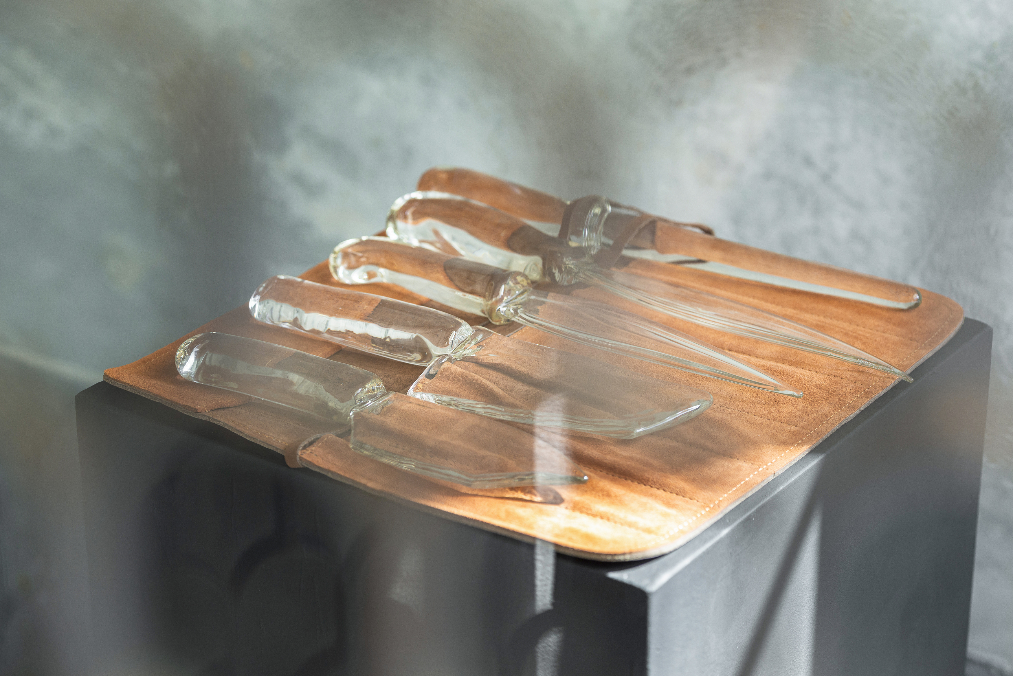 “Naturaleza muerta con cuchillos”. The butcher’s knives—tools of a traditional trade, weapons that cut, divide, dissect—represent here an object with multiple layers of meaning. The material they are made of, Murano glass, is a tribute to artisanal craftsmanship, but in this dual reading also to the commercialization and mercantile capitalism that has historically marked a city now “for sale,” one that is rapidly losing its essence as a living urban core despite ongoing attempts at resistance.