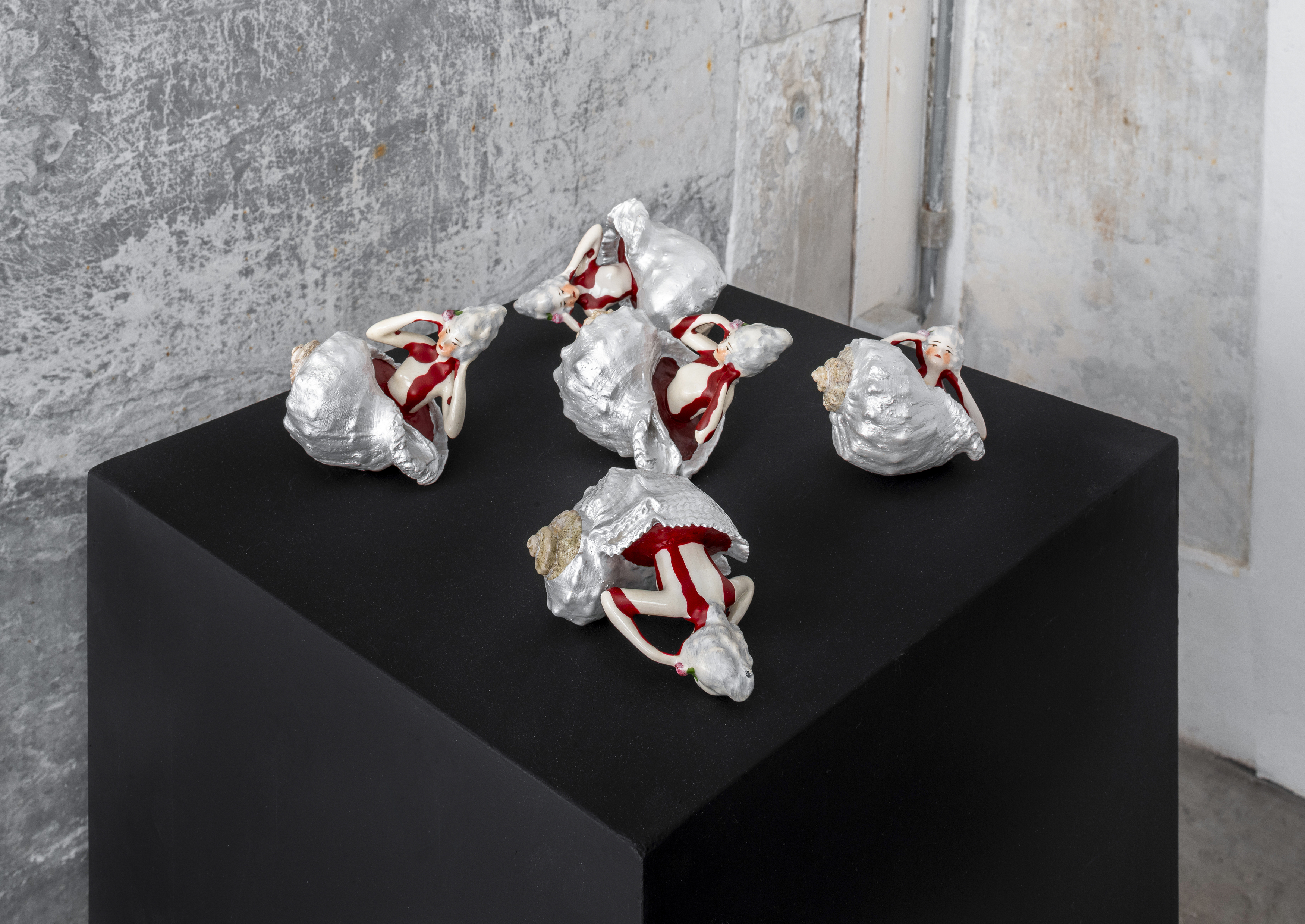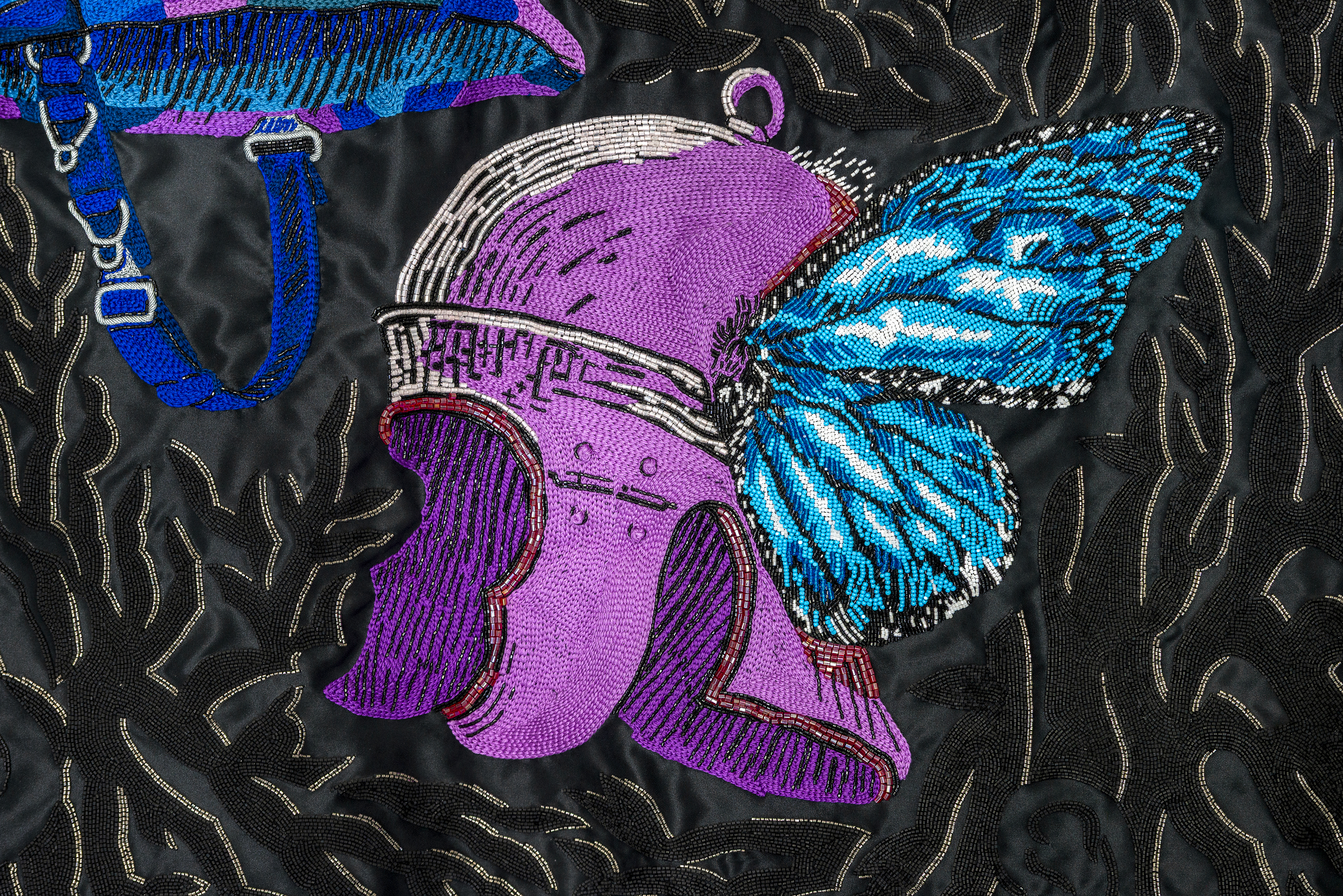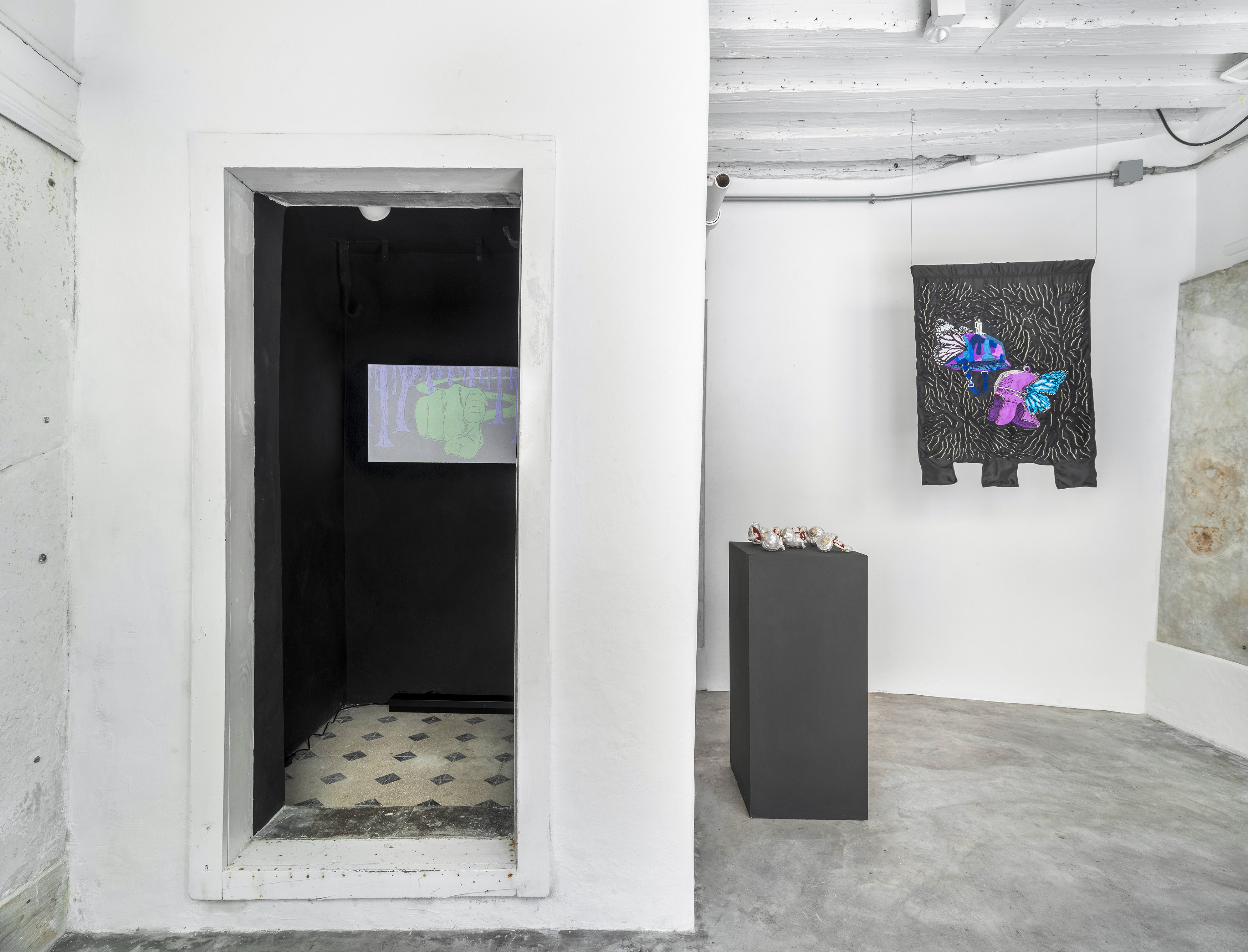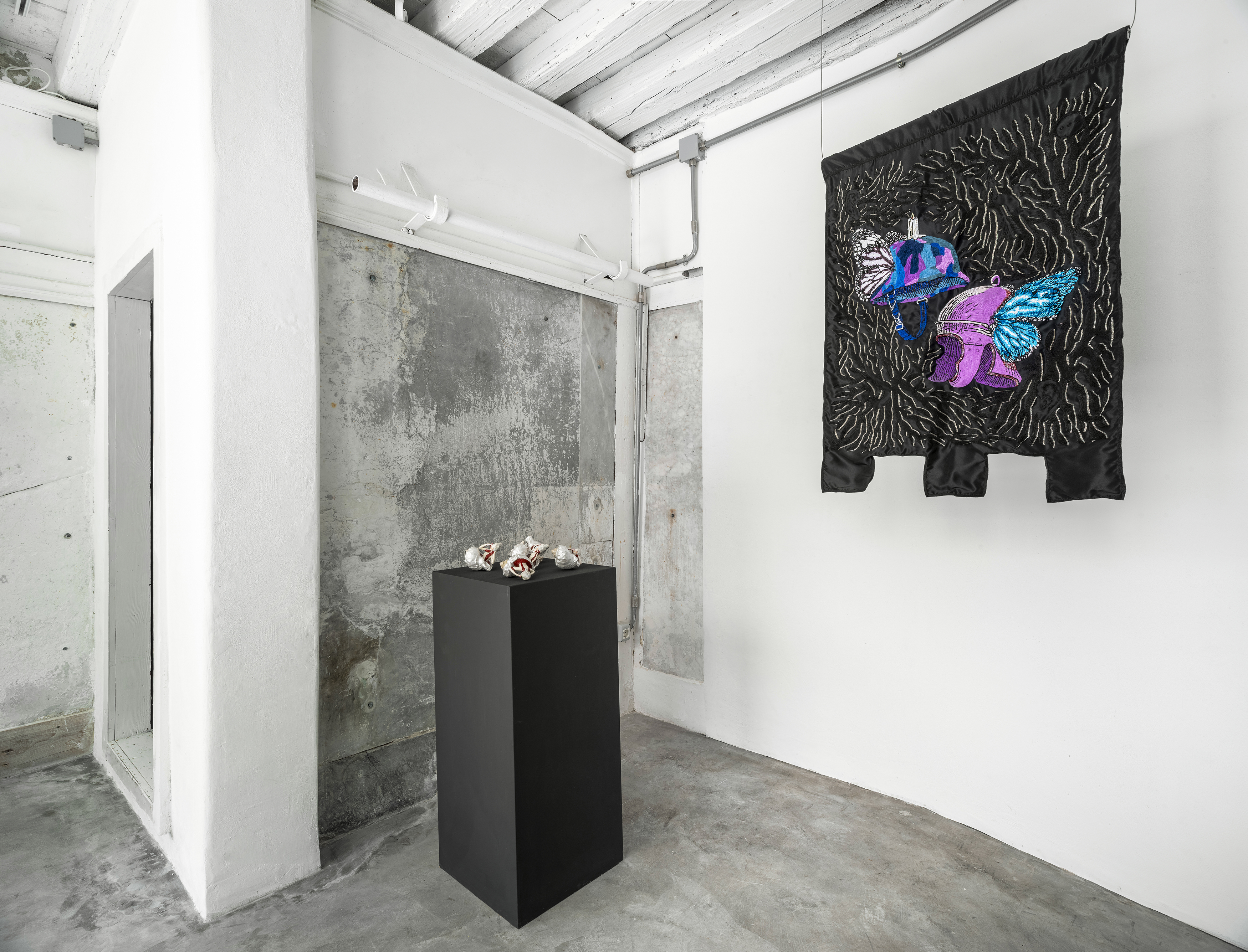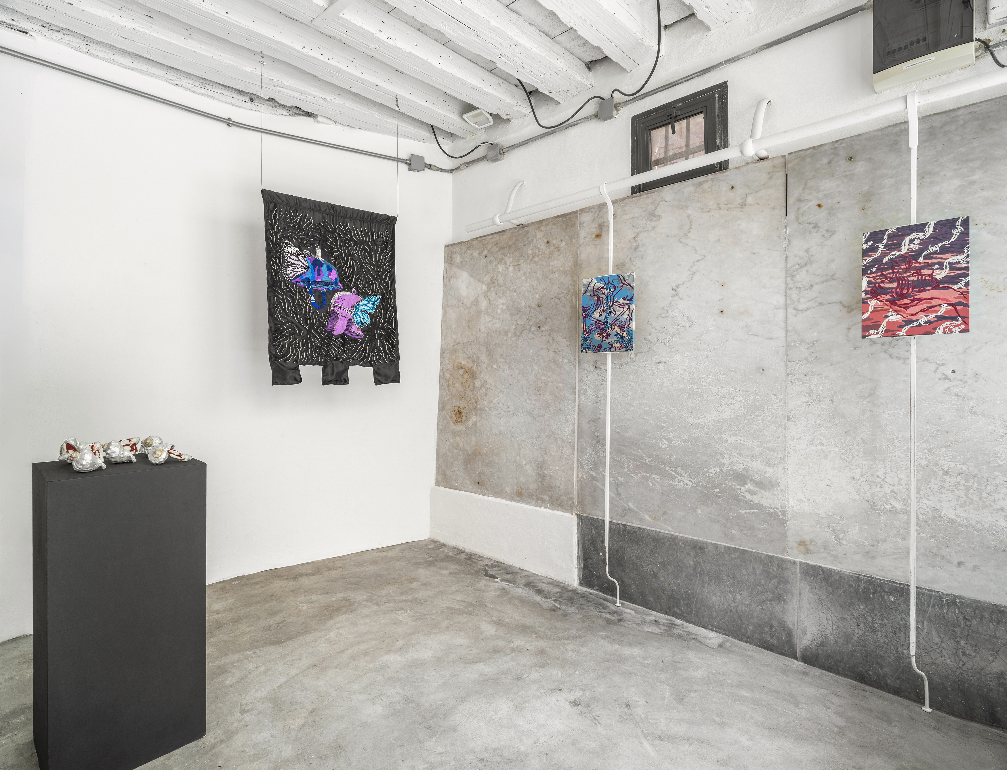 The exhibition is also the result of several collaborations. Among these is the group of Ready-Made sculptures created with Bruno Di Costanzo, and the banner produced with the support of JL Atelier Couture, a company specializing in embroidery for luxury fashion, with whom the artist continues a path of dialogue with the world of textiles and craftsmanship.